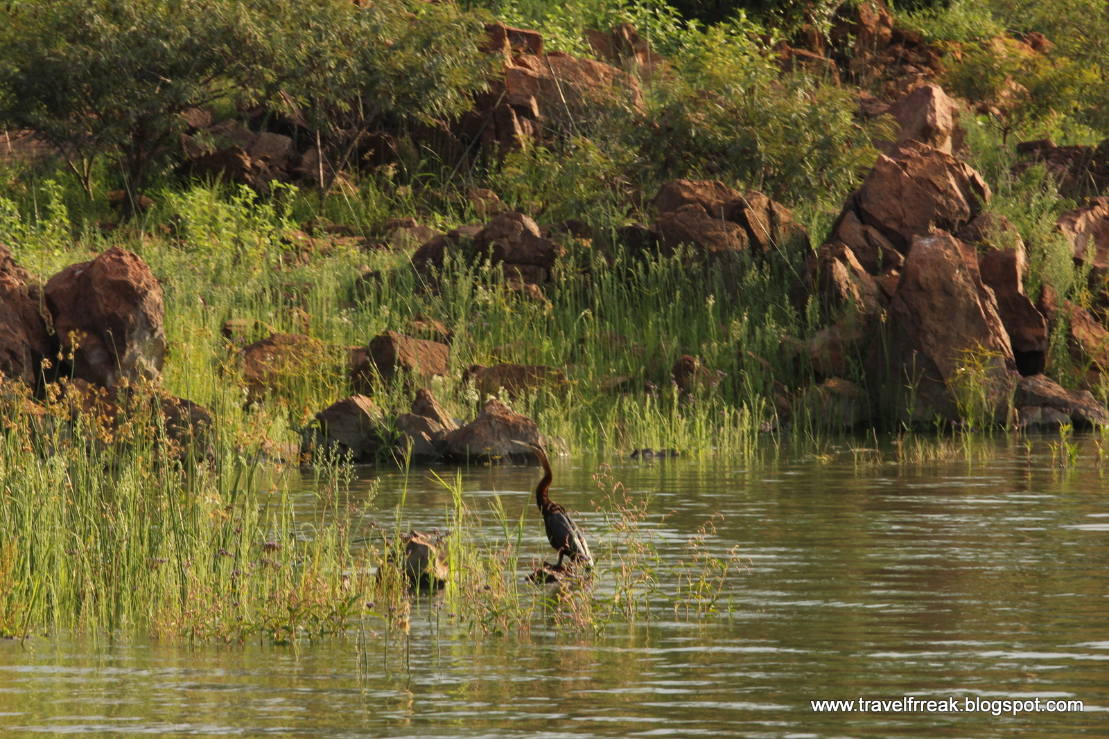 While boating around the central island, we saw and heard loads of birds - Fish eagle and Goliath eagle being the major ones amongst them. The only other bird which I can recall is the snakebird (or the African darter), which we saw in action too. It swoops into the water to catch its prey. And then swims in such a way that only the neck is above the water giving it the look of a snake moving with its head out of the water!